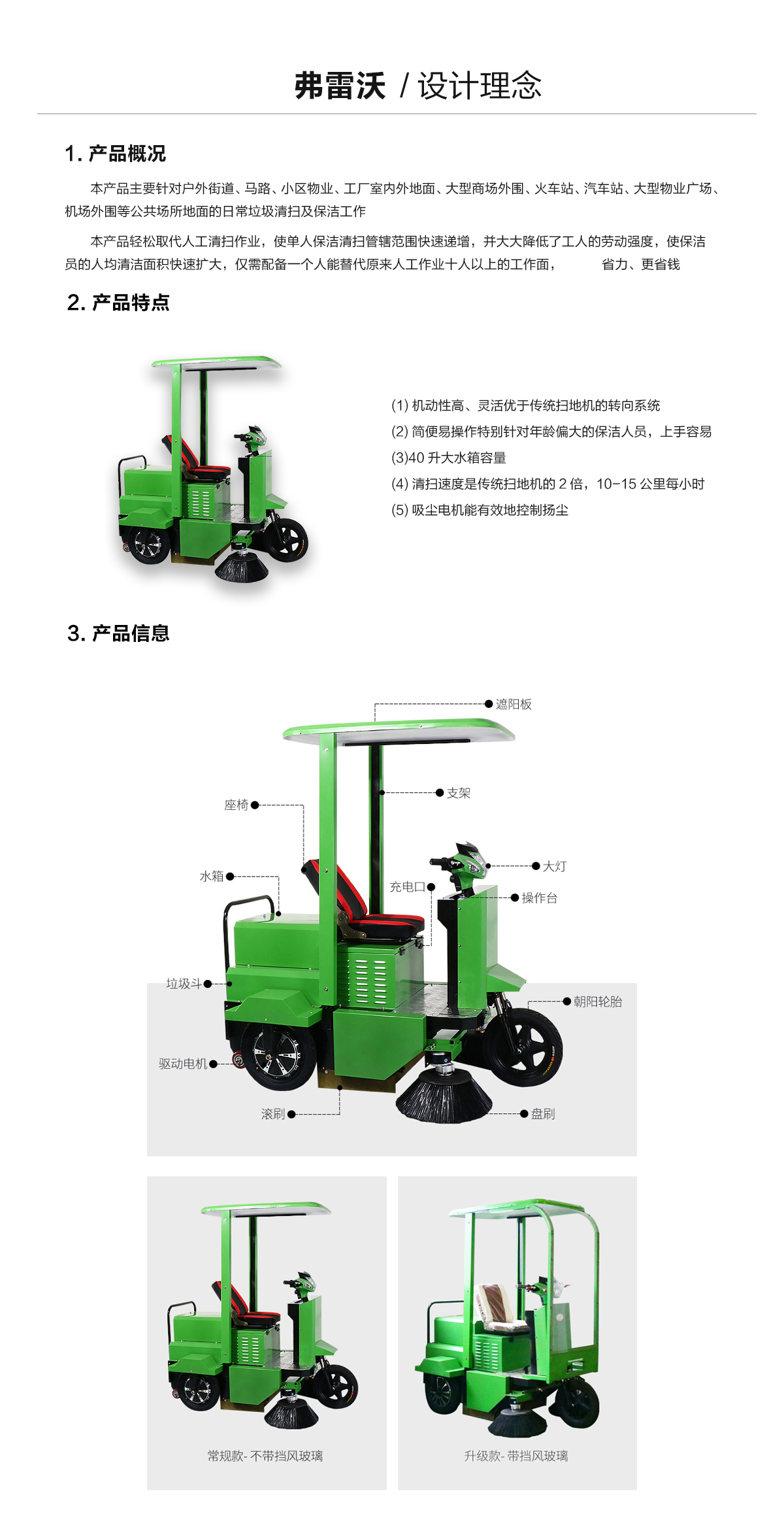 產(chǎn)品分類:駕駛式掃地機(jī)(可加裝擋風(fēng)玻璃)產(chǎn)品特點(diǎn):1、駕駛式掃地機(jī)FL1650配備出口型免維護(hù)電瓶,區(qū)別于市面上其他電動掃地機(jī),其智能型充電機(jī)能有效延長電瓶使用壽命,可使連續(xù)工作時間更長。2、操作簡單、便捷,對于年齡較大的保潔人員也可以無需通過特別培訓(xùn)即可上崗使用。3、雙邊刷設(shè)計(jì),顯著提升清掃效率,完成1000㎡的地面清掃工作僅需5分鐘。4、配備優(yōu)良吸塵電機(jī)和曬水系統(tǒng),能夠在清掃地面灰塵時灑水,有效避免揚(yáng)塵的產(chǎn)生。適用環(huán)境:戶外街道、小區(qū)物業(yè)、工廠車間、商場、車間、機(jī)場、學(xué)校、醫(yī)院、公園、廣場等地。
