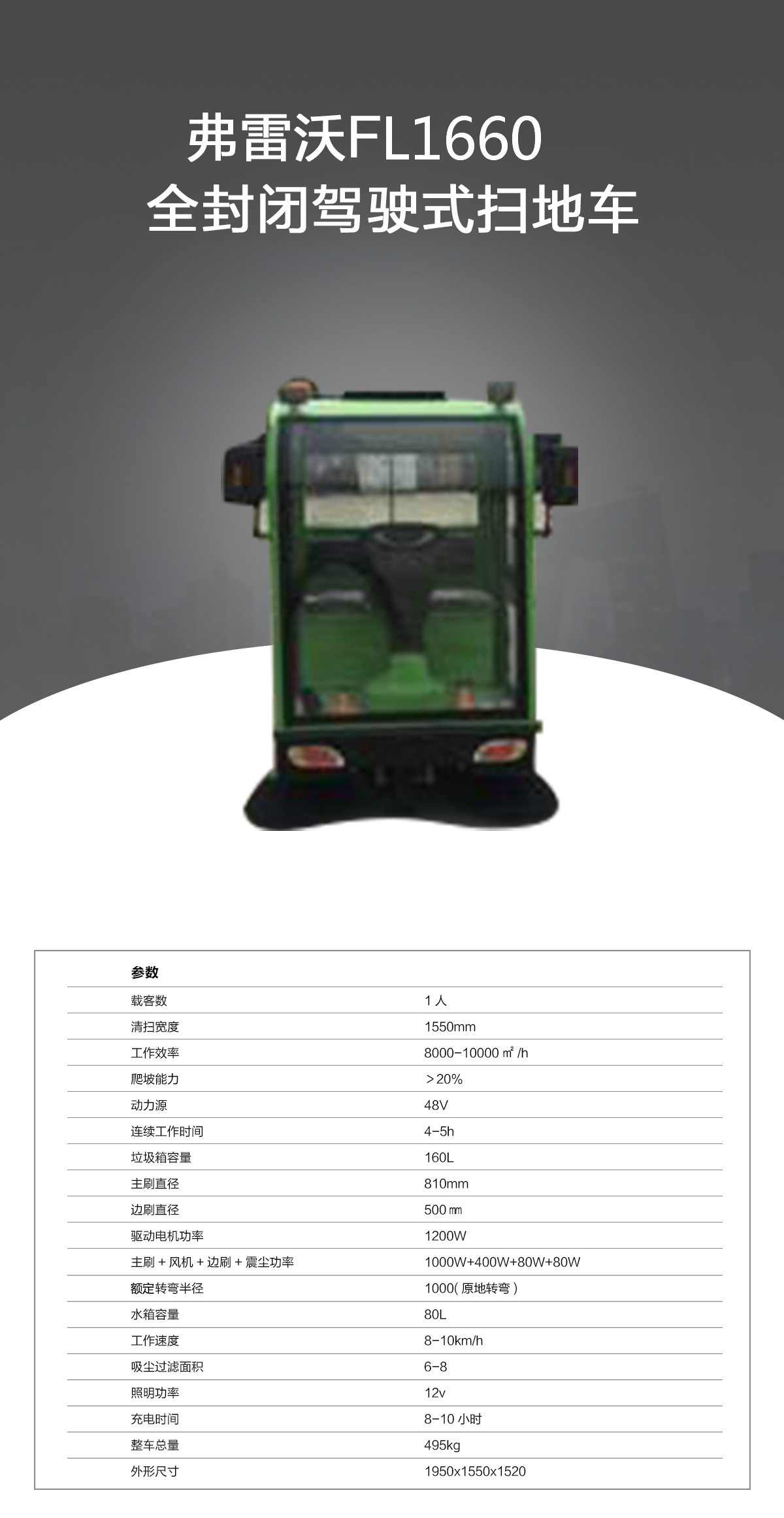 產(chǎn)品分類:駕駛式掃地機(jī)產(chǎn)品特點(diǎn):1、全封閉駕駛式掃地機(jī)1660特有出口型免維護(hù)電瓶,區(qū)別于市面上其他電動掃地機(jī),其智能型充電機(jī)能有效延長電瓶使用壽命,可使連續(xù)工作時(shí)間更長。2、全封閉設(shè)計(jì)保護(hù)工作人員身心健康。3、底部主刷和兩側(cè)邊刷可自由調(diào)節(jié)高度使清掃效率更高,清掃寬度達(dá)到1550mm,完成1000㎡的地面清掃工作僅需6分鐘,比傳統(tǒng)人力清掃效率提高幾十倍,并且還能節(jié)省人力成本,省時(shí)省力、更省錢!4、控制面板友好,操作簡單、易懂,使用前工作人員無需特別培訓(xùn),“保潔大媽也能輕松操作完成清掃任務(wù)”。5、配備的優(yōu)良吸塵系統(tǒng)能夠有效抑制揚(yáng)塵的產(chǎn)生,避免二次污染。適用環(huán)境:車站、機(jī)場、物業(yè)小區(qū)、倉庫、車間、園區(qū)、廣場、學(xué)校、醫(yī)院、商場、公園、市政單位、街道等公共場所地面。